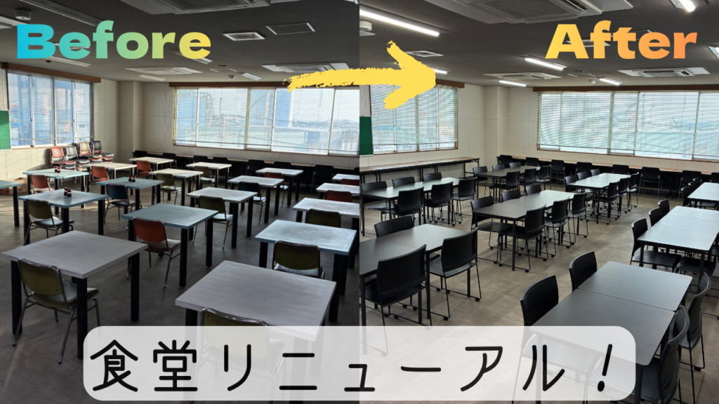 食堂の机と椅子をリニューアルし、座席の配置も少し変更しました。「より座りやすく、使いやすく」を意識して整えています。
